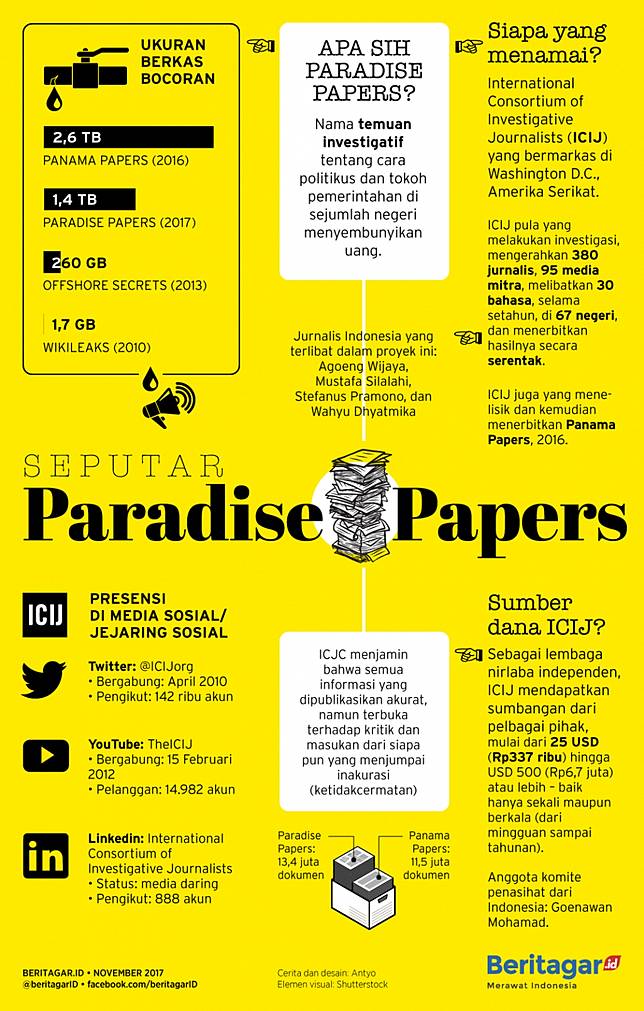 Ajakan itu muncul di laman Bocorkanlah kepada Kami, dalam situs International Consortium of Investigative Journalists (ICIJ), lembaga yang kemarin (5/11/2017) mengumumkan Paradise Papers. Lalu jadilah info di mana-mana. Serupa Panama Papers tahun lalu.